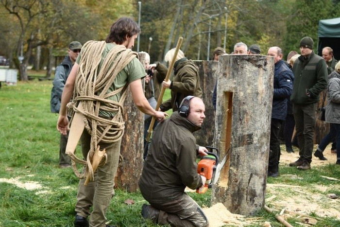 Pokaz wchodzenia na leziwie [przyrząd do wspinania się] w wykonaniu Piotra Piłasiewicza z Bractwa Bartnego